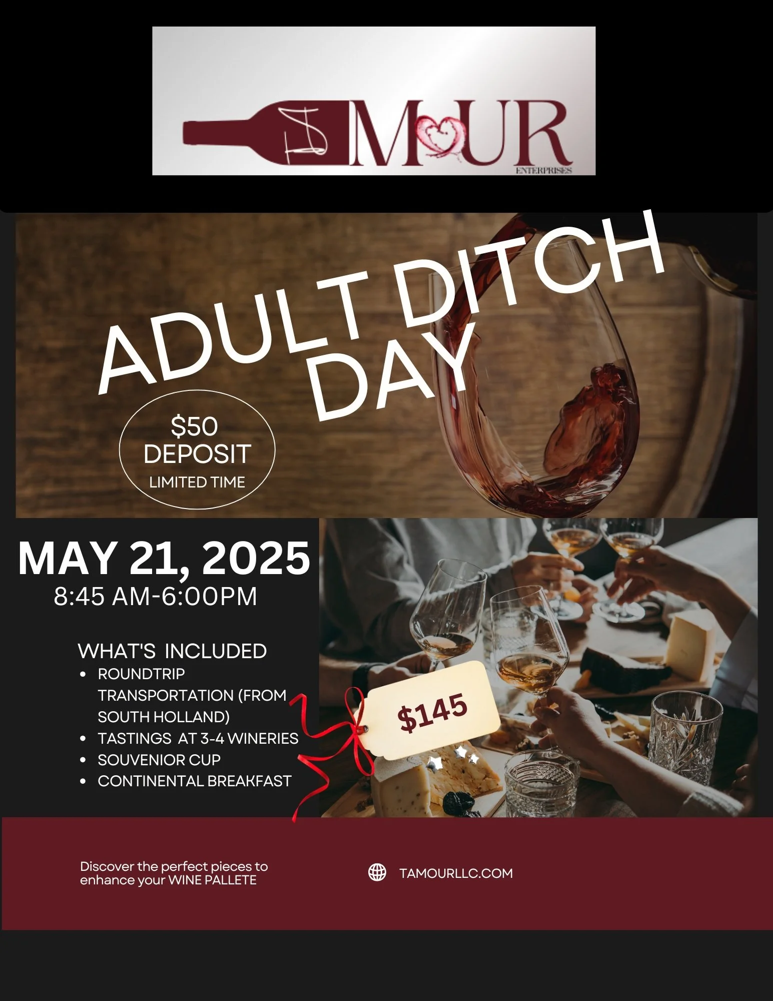 Shop All Quick View Alex Birthday Bourbon tour $50.00 Quick View Adult Ditch Day Deposit Only $50.00 Quick View Adult Ditch Day $145.00 Quick View Christmas Wine Basket Sale Price: $55.99 Original Price: $60.00 Sale Quick View Personalized Wine Bottle $30.00 Quick View Personalized Wine Bottle $30.00 Quick View Personalized Wine Glasses Sale Price: $35.99 Original Price: $40.00 Sale Quick View T'Amour T-shirt from $30.00